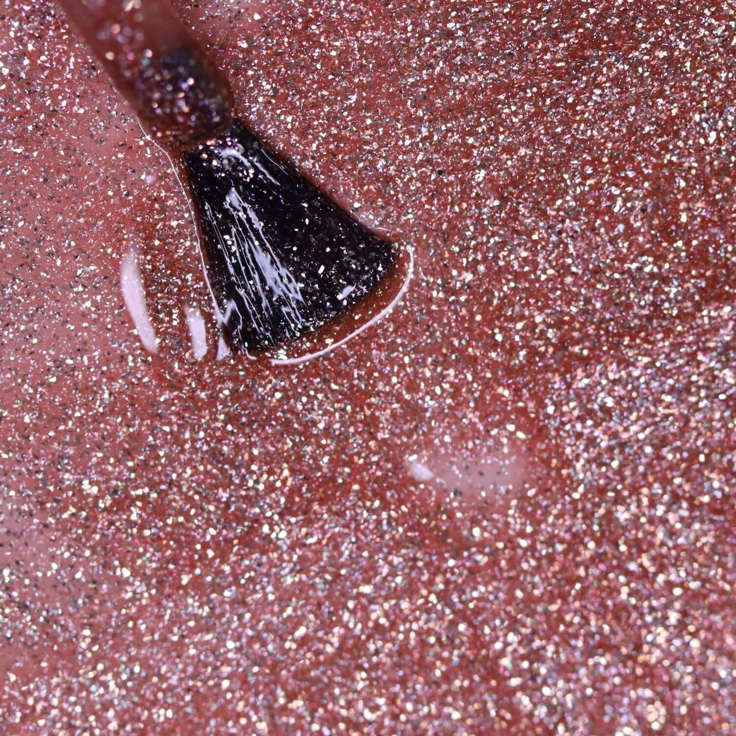 Goddess  es de color rosa oscuro / marrón con mucha purpurina. Las partículas de purpurinas reflejan un tono bronceado dorado. Perfecto para el verano. Tiene un acabado cubriente.